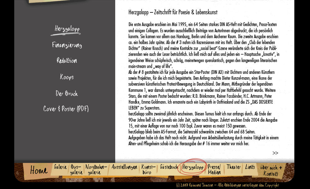 FinanzierungHerzgalopp-RedaktionHerzgalopp-Coopsder BruchDownloadsGästebuchPresse / MedienTheaterLinksVita & Kontaktmöglichkeitnächste SeiteKunstbüro WilhelmsburgAusstellungsverzeichnisNordbahn-GalerieBusgalerie in HH-WilhelmsburgGalerieHome